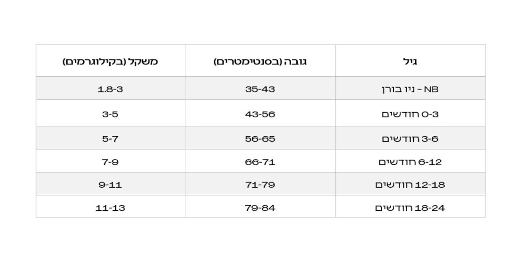 טבלת מידות אקורנלו בגדים בריאים לילדים