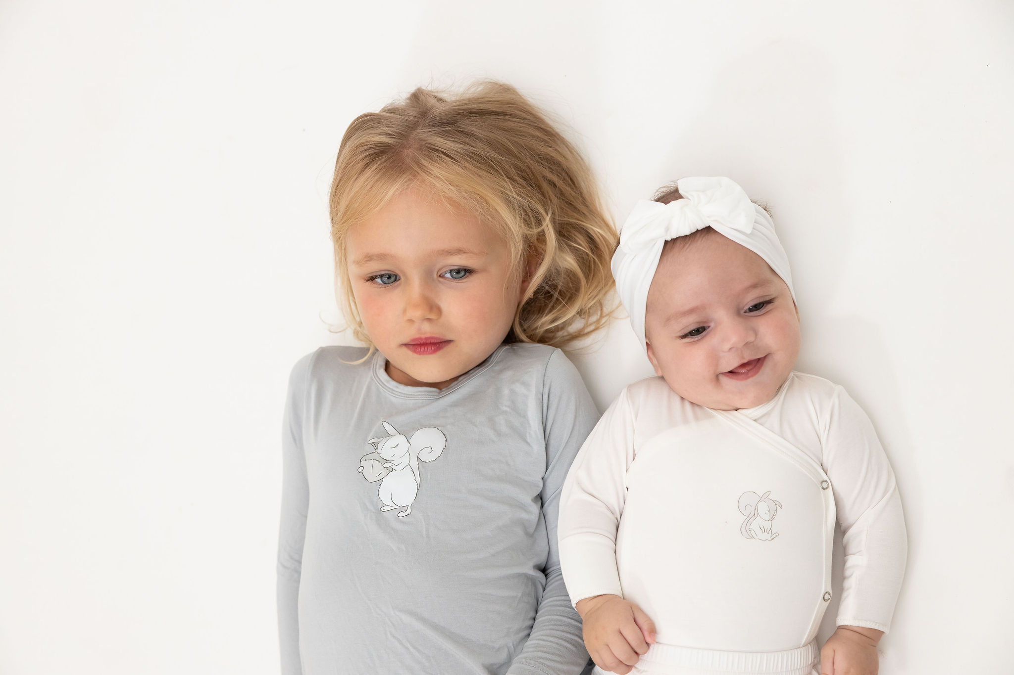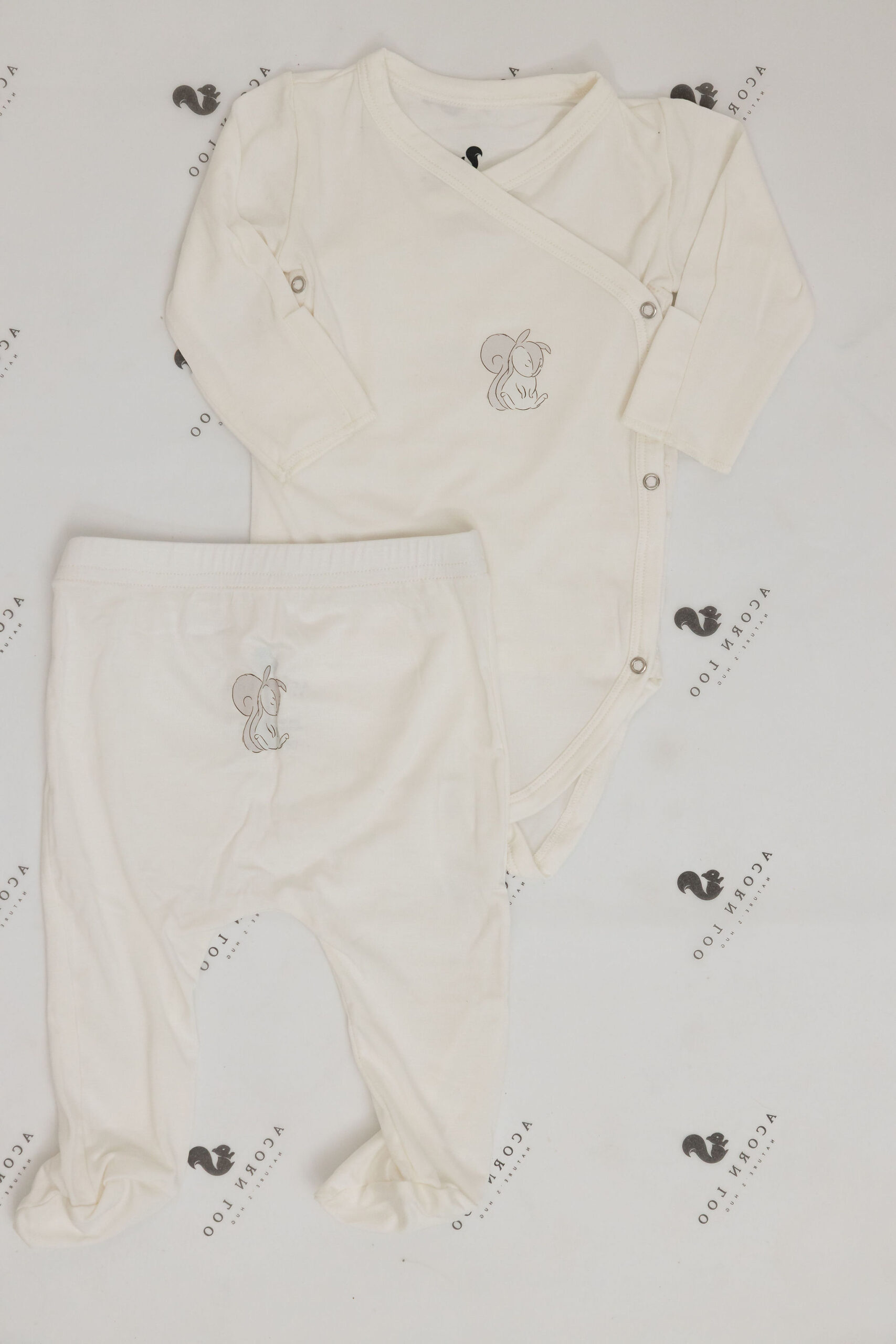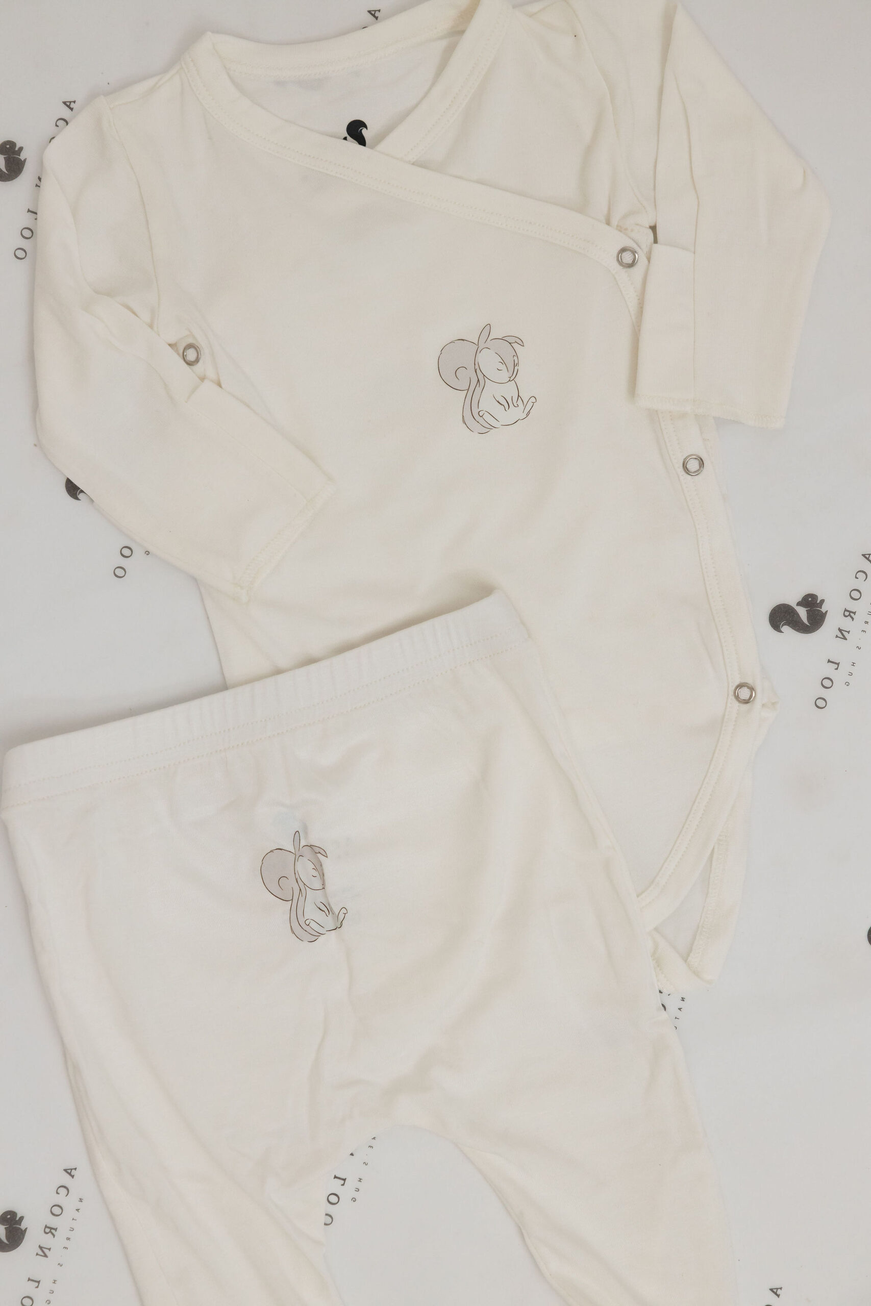 בגד גוף מעטפת נוח ומעוצב, מגיע עם מכנס רגלית תואם. בחזית מתנוסס ציור מתוק של סנאי ישן, ובגב – על הישבן – הדפס תואם להשלמת המראה.