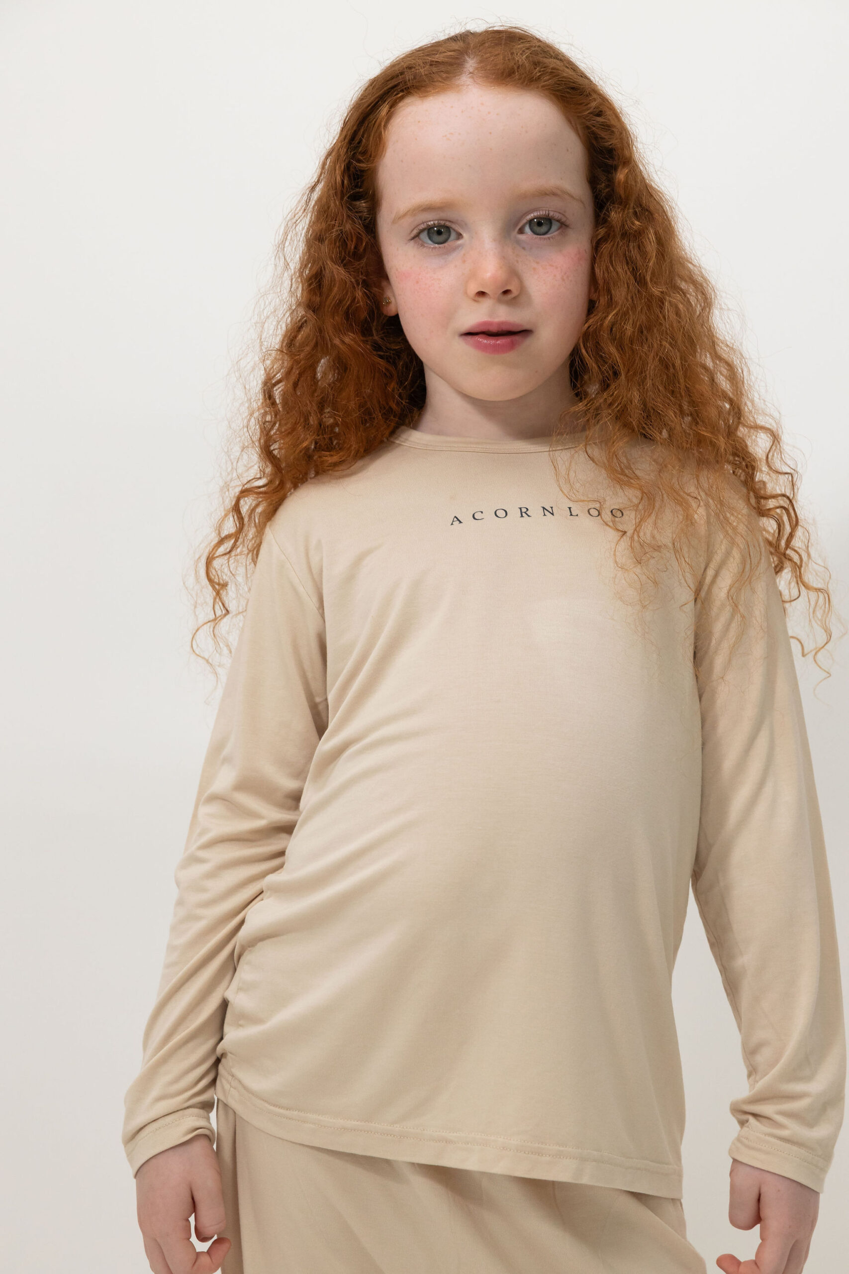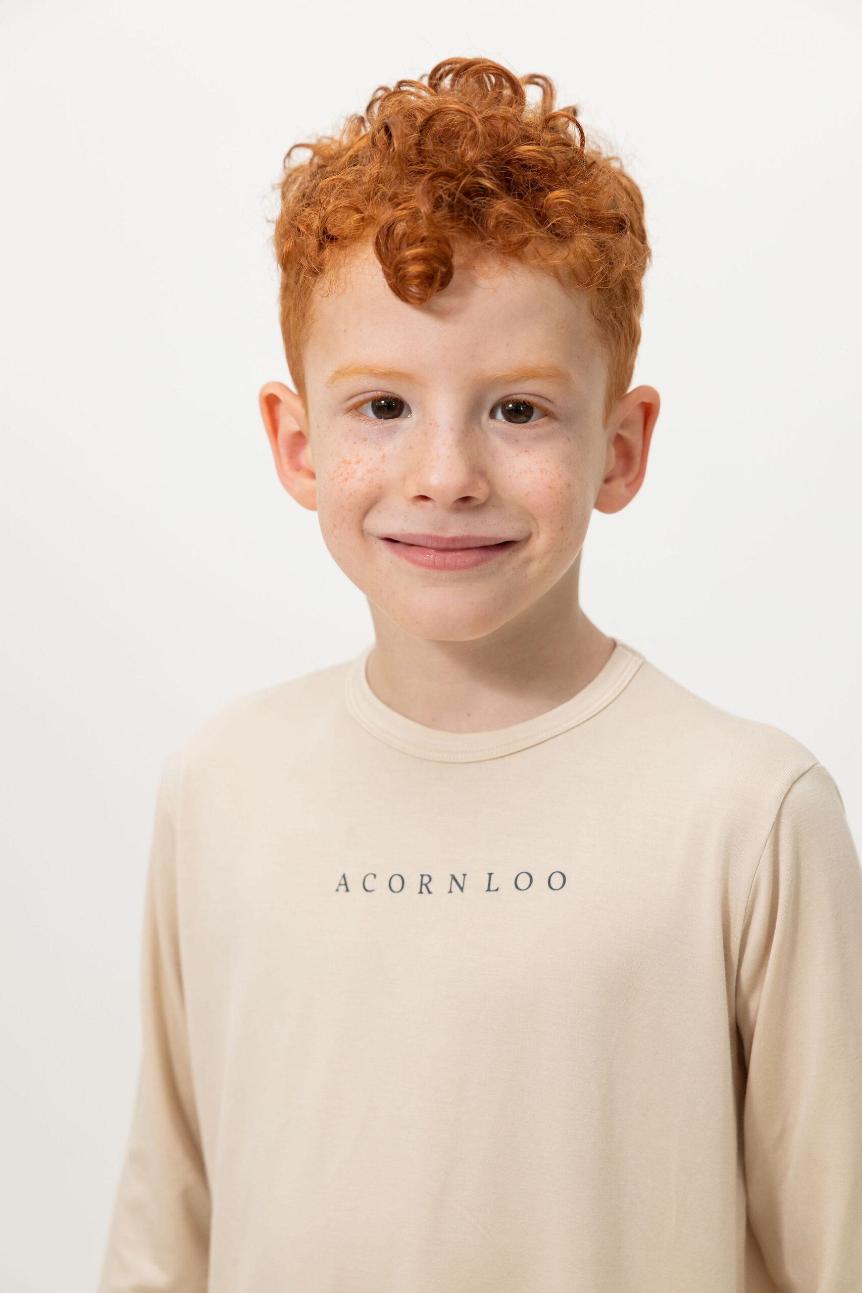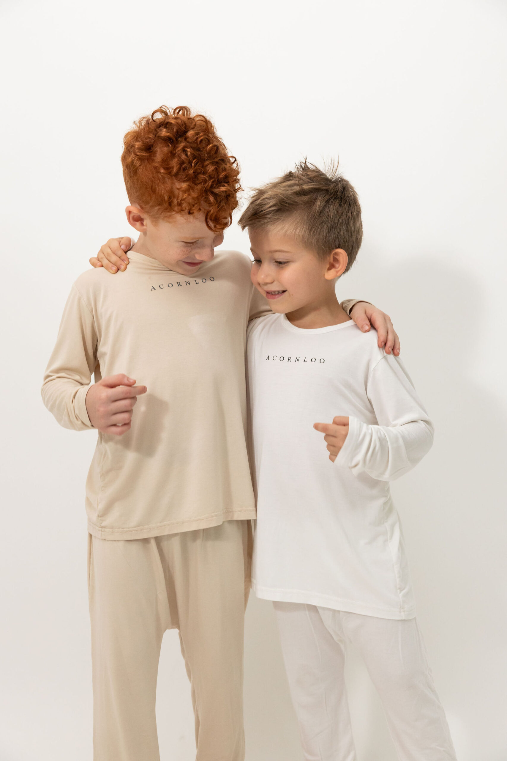 חולצה עם כיתוב AcornLoo בחזית, בשילוב מכנס תואם עם כיתוב תואם בחלקו האחורי – סט מלא סטייל ונוחות לקטנטנים.