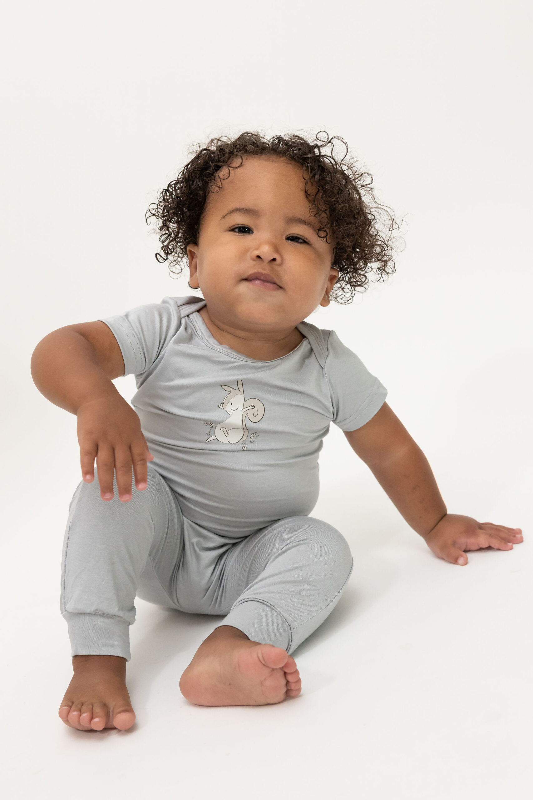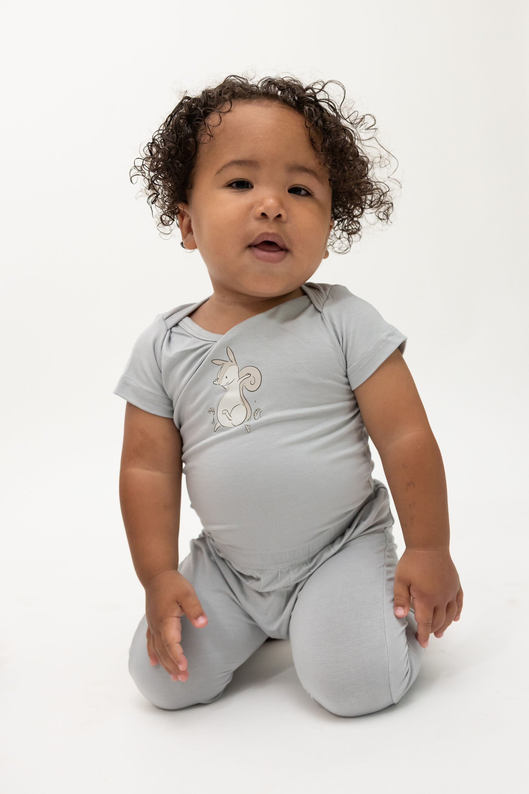 מגיע עם מכנס ללא רגלית, בעיצוב תואם עם איור סנאי קופץ חמוד על הישבן. זמין בצבע תכלת ובמידות 6–12, 12–18 ו־18–24 חודשים.